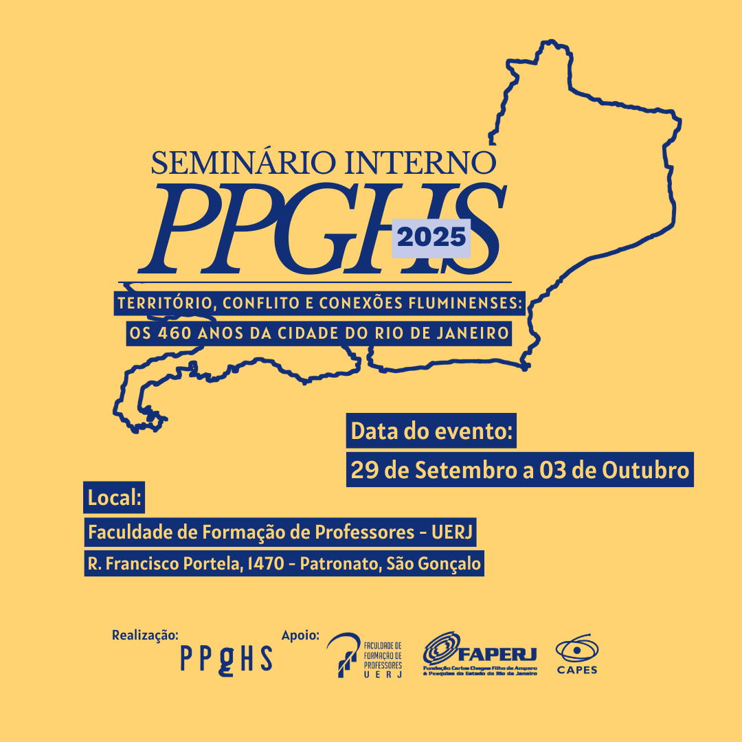 O Programa de Pós-Graduação em História Social da Universidade do Estado do Rio de Janeiro (PPGHS – UERJ/FFP) promoverá entre os dias 29 de setembro e 03 de outubro de 2025 a 13ª edição do seu Seminário Interno. O evento será presencial no Campus da Faculdade de Formação de Professores da UERJ em São Gonçalo (RJ) e nesta edição contará com duas sessões, a saber: apresentações de trabalhos de pós-graduandos com matrícula ativa e comunicações de egressos.